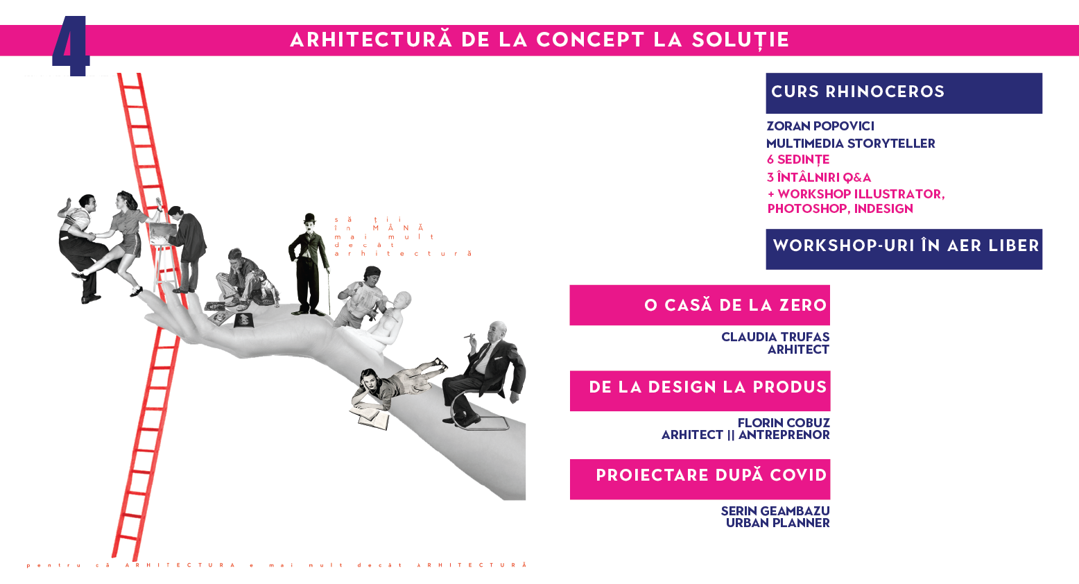 Cea de-a patra ediție The Challenge Academy a conectat partea teoretică din mediul online cu lucrul practic din cadrul workshopurilor organizate în aer liber. Cursul de modelare 3D în Rhinoceros și cursul de grafică au fundamentat cunoștințele studenților, iar abilitățile dobândite au fost baza teoretică pentru cele trei workshop-uri: A House from Scratch– Coordonat de Claudia Trufaș, fondatoare Citrus Studio,   Workshop From Design to Product – Coordonat de Florin Cobuz, co-fondator Nod makerspace, Workshop Post Covid Planning – Coordonat de Serin Geambazu.